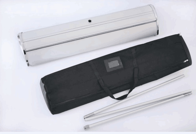 É um suporte portátil de bandeira de rolos de alumínio médio! Tudo se encaixa dentro da bolsa de transporte acolchoada, tornando-a fácil de transportar; e protege com segurança a impressão da bandeira quando não está em uso;
